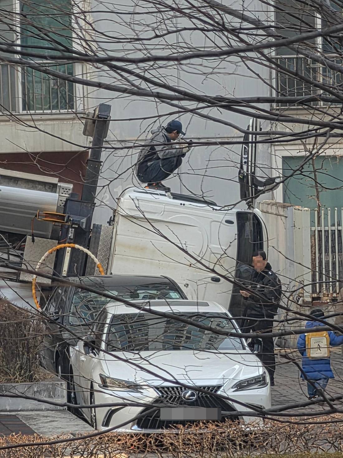 사고 직후 현장에서는 관계자들이 차량 위로 올라가 장비 상태를 확인하며 수습 작업을 진행하는 모습도 포착됐다. 사다리차 본체는 한쪽으로 완전히 기울어진 채 멈춰 있었고, 주변에는 주민들이 상황을 지켜보는 모습도 보였다.