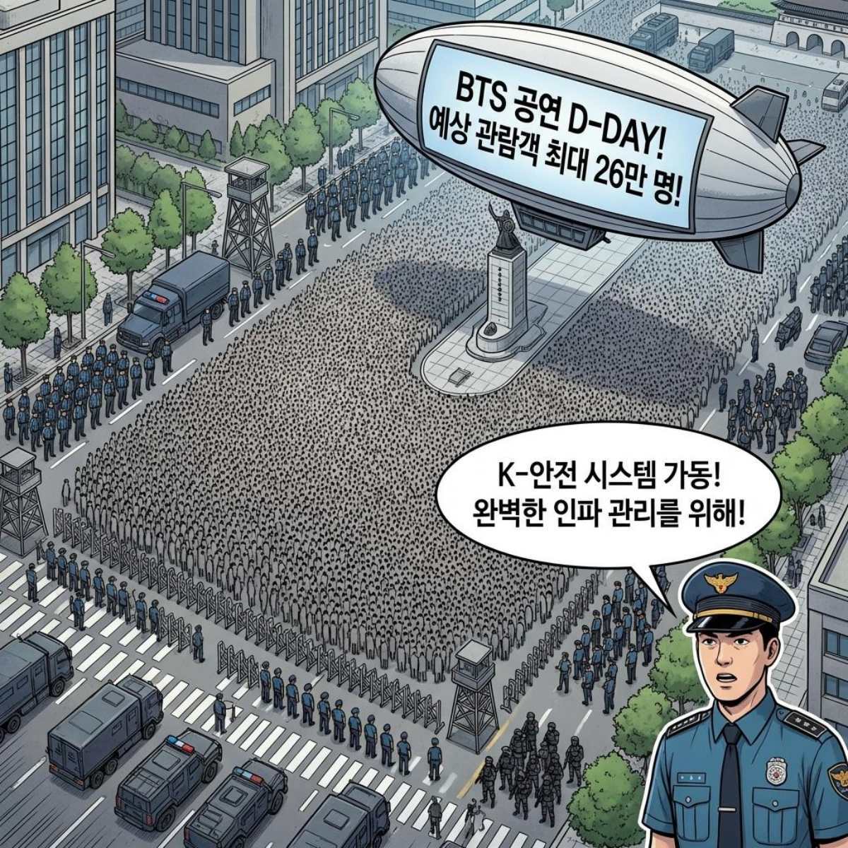 경찰이 오는 21일 서울 광화문광장에서 열리는 방탄소년단(BTS) 공연에 대비해 대규모 인파 관리와 안전 대책을 마련했다. 예상 관람객이 최대 26만 명에 이를 것으로 전망되면서 광화문 일대 교통 통제와 함께 ‘스타디움형 인파 관리 방식’이 적용된다.