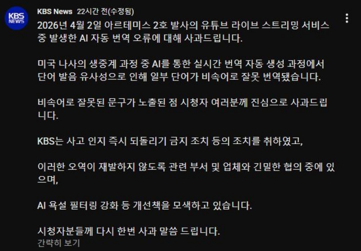 논란이 커지자 KBS는 같은 날 유튜브 커뮤니티를 통해 공식 사과문을 올렸다. KBS는 “아르테미스 2호 발사의 유튜브 라이브 스트리밍 서비스 중 발생한 AI 자동 번역 오류에 대해 사과드린다”며 “NASA 생중계 과정에서 AI 기반 실시간 번역 자동 생성 중 발음 유사성으로 인해 일부 단어가 비속어로 잘못 변환되는 오류가 발생했다”고 설명했다.