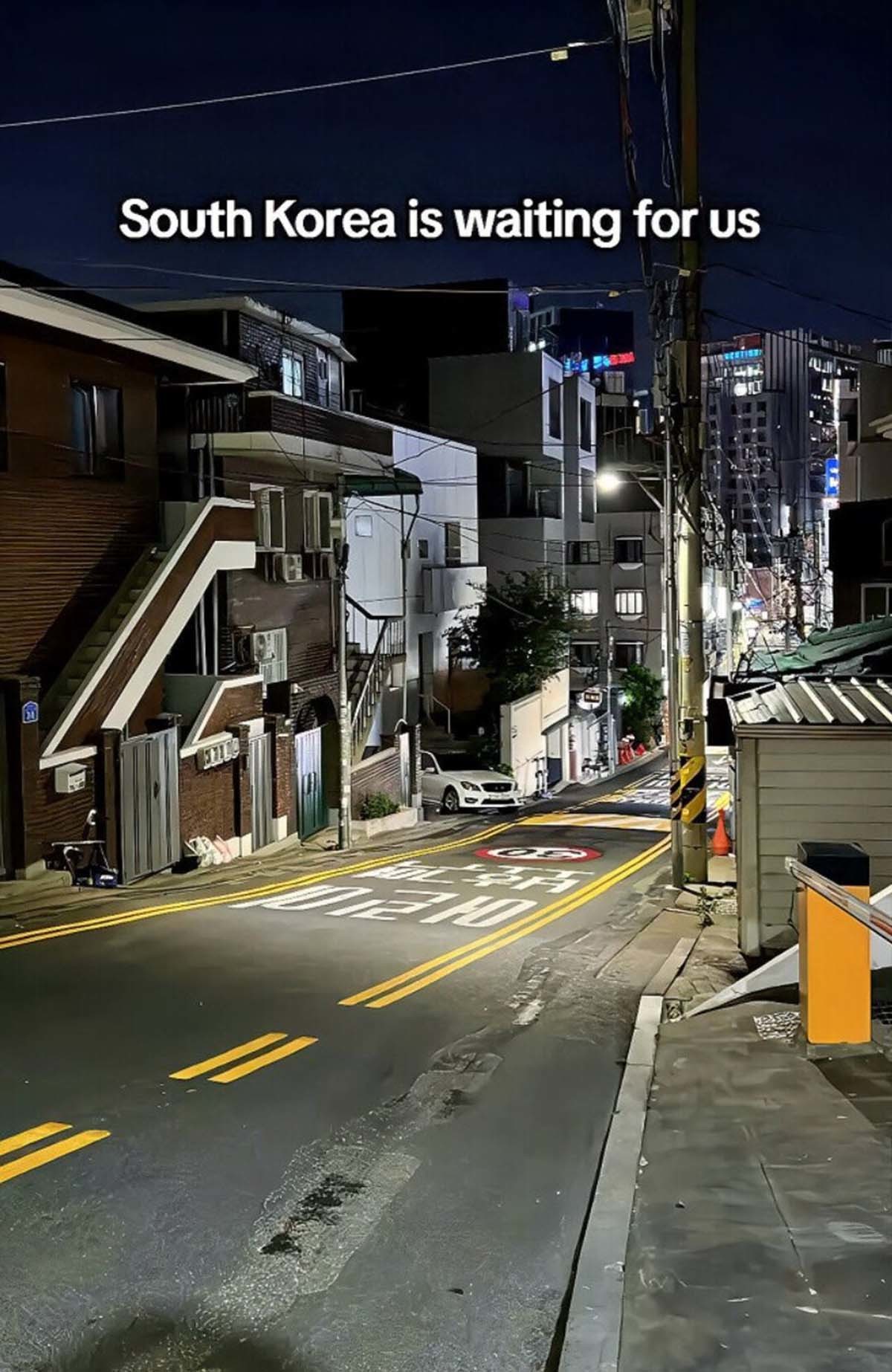 "South Korea is waiting for us(한국이 우리를 기다린다)." 사진에 적힌 문구다. 경기 지역 한 도시의 골목길을 담은 것으로 보이는 야경 사진이 X에 올라와 국내 온라인 커뮤니티에도 빠르게 퍼졌다. 반응은 한결같았다. "이게 왜?" "진짜 저게 왜?" "어느 요소를 봐야 하는지 아직도 모르겠음.“