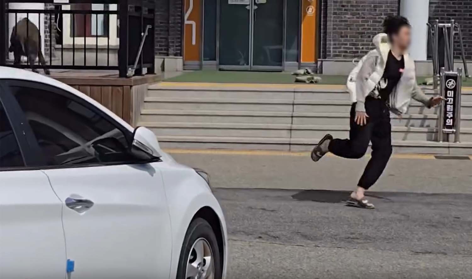 영상엔 20대로 추정되는 남성이 멧돼지를 피하는 아찔한 모습, 상황을 인지하지 못한 채 성난 멧돼지 옆을 지난 검은 옷을 입은 남성의 경우 멧돼지가 방향을 트는 바람에 충돌을 피한 것으로 보인다.