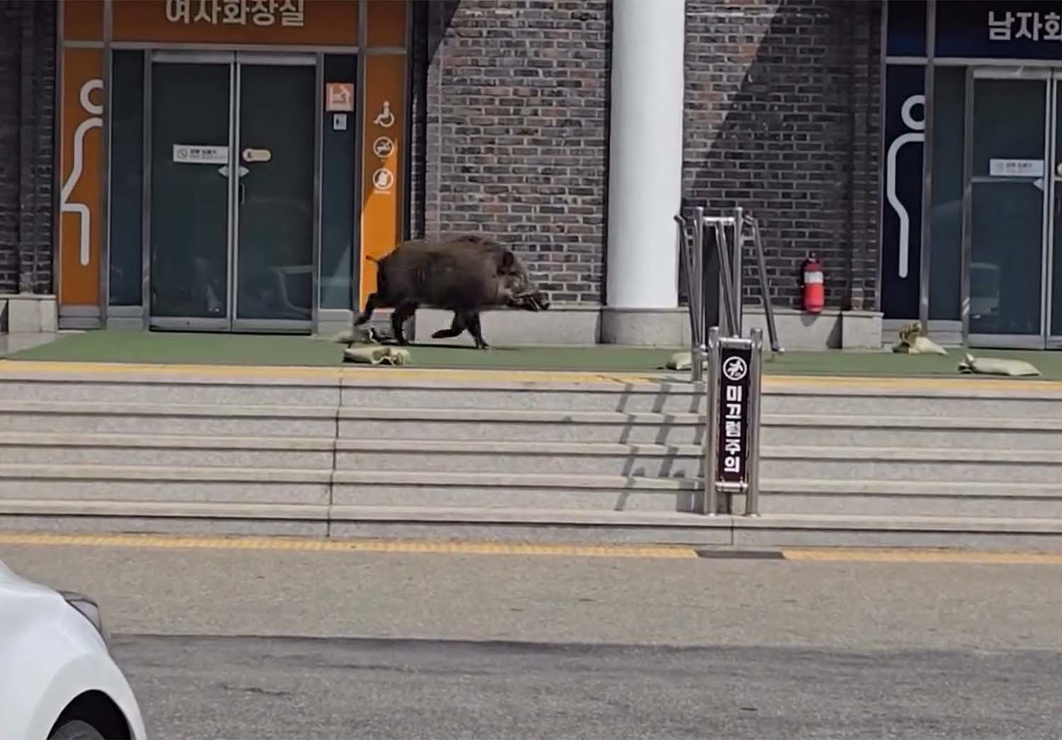 봄볕이 완연한 주말. 수많은 여행객이 오가는 고속도로 휴게소 한복판에 멧돼지 한 마리가 불쑥 나타났다. 성체로 보이는 멧돼지는 먼저 맞춤 의상실 유리문을 향해 머리로 수차례 들이받았다. 진입에 실패하자 이번에는 여자 화장실로 방향을 틀어 유리문을 들이받기를 반복했다. 다행히 유리문이 버텨 내부 진입은 모두 막혔지만 수많은 방문객이 오가는 휴게소 한복판에서 벌어진 까닭에 자칫 인명사고로 이어질 수 있었던 위험천만한 상황이었다.