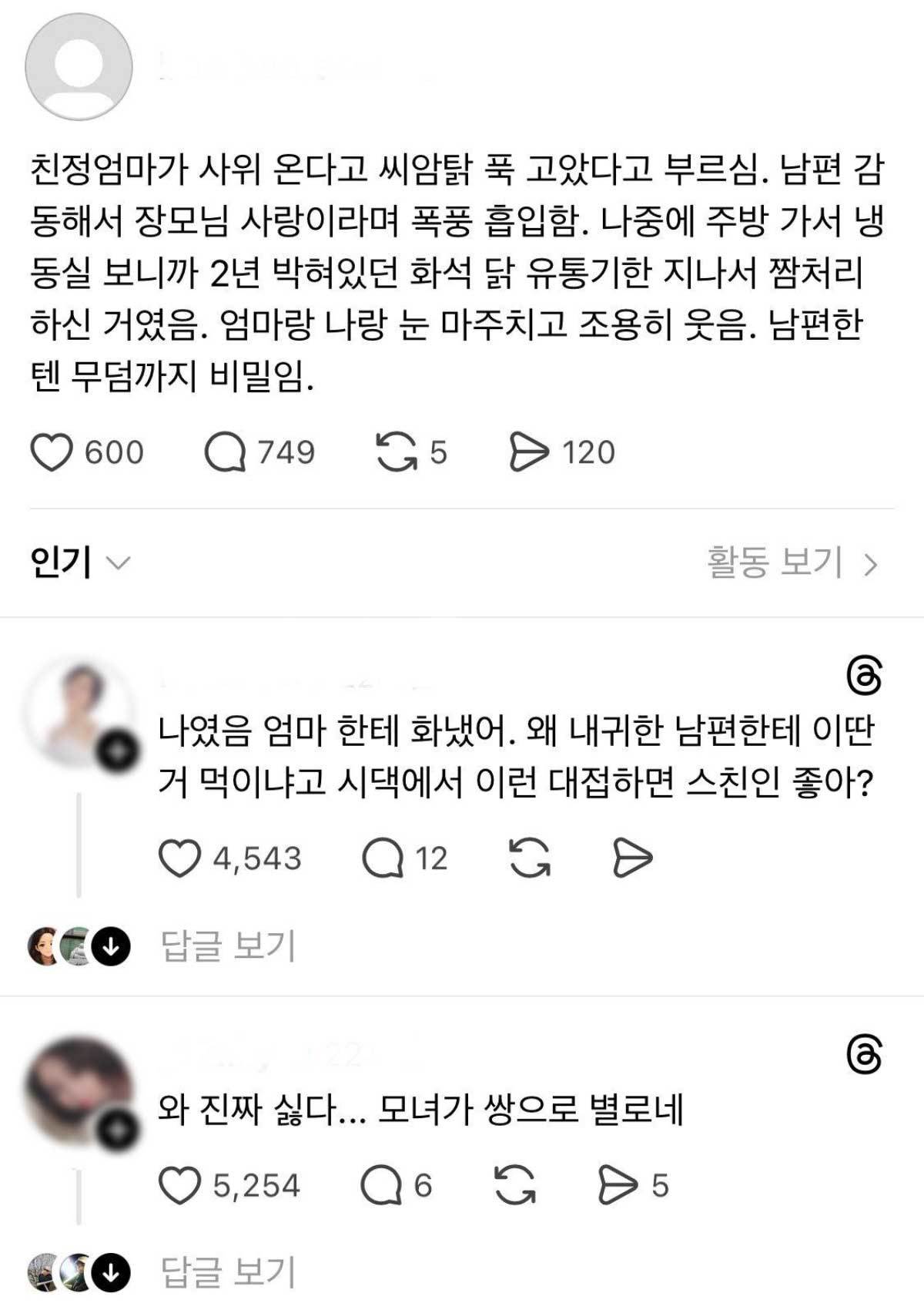 이 게시물에는 수백 개의 댓글이 달리며 네티즌들의 반응이 쏟아졌다. 비판적 시선이 압도적으로 우세한 가운데 "그 어미에 그 딸"이라거나 "이래서 결혼 전에 여자친구 엄마를 보라고 하는 것"이라는 반응이 높은 공감을 받았다. 사위에게 유통기한 지난 닭을 먹인 것도 모자라 딸마저 그 사실을 숨기고 웃었다는 대목에서 "인성 문제"라는 지적이 쏟아졌고, 아내의 태도가 더 문제라는 댓글도 잇따랐다.