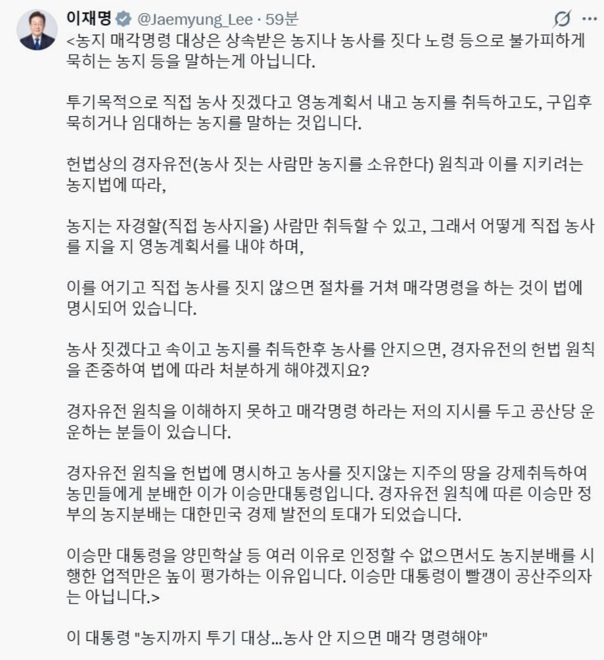 이 대통령은 25일 엑스(X·옛 트위터)에 글을 올려 “농지 매각명령 대상은 상속받은 농지나 농사를 짓다 노령 등으로 불가피하게 묵히는 농지를 말하는 게 아니다”라고 밝혔다.