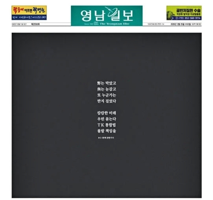 지난 25일 검정색 배경으로 인쇄돼 발행된 영남일보 1면은 “野(야)는 막았고 與(여)는 눈감고 또 누군가는 딴지 걸었다. 캄캄한 미래 우린 묻는다. TK 통합법 불발 책임을”이라는 문구만 남겼다.