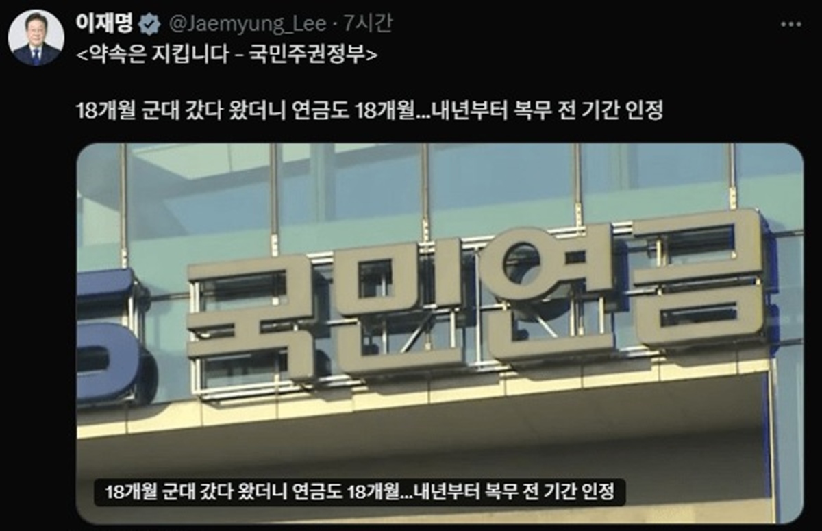 이날 이 대통령은 "약속은 지킵니다, 국민주권정부"라는 한마디와 함께 군 복무 전 기간을 국민연금 가입 기간으로 인정하는 정책을 소개한 기사를 링크했다. 대선 공약이었던 '군 복무 크레딧 제도' 개편 이행을 직접 확인시켜준 것이다.