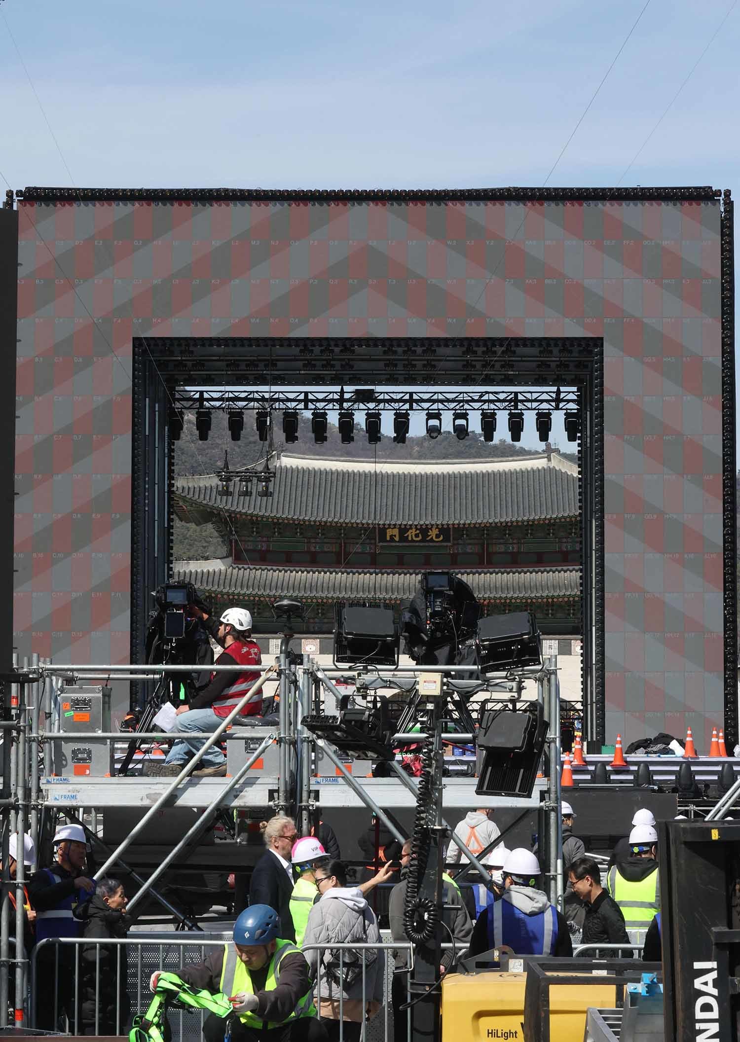 공연장 자체는 가상의 스타디움 개념으로 설계됐다. 광화문 월대 맞은편부터 이순신 장군상을 지나 시청역까지 남북으로 1.2㎞, 동서로 200m 구간을 경계로 삼아 이 안팎을 완전히 다른 공간으로 나눈다. 행사 당일 오전 7시부터 서쪽 15개, 동쪽 16개 등 총 31개 게이트로만 드나들 수 있으며, 각 게이트에는 문형 금속탐지기가 설치돼 위험물 반입을 막는다. 게이트 안쪽에는 경찰특공대와 기동대가 상주한다. 내부 혼잡도가 높아지면 추가 유입을 즉시 차단하고 바깥으로 인파를 분산 유도하는 방식이다.