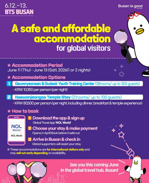 관광객 수용 태세 확립을 위한 고강도 대책도 시행된다. 시는 4월 말부터 2주간 숙박료 폭등 및 부당 취소 근절을 위한 집중 점검에 돌입하며, 공연 당일 도시철도 증편 등 빈틈없는 교통 대책을 수립한다. 특히 부족한 숙소 문제를 해결하기 위해 공공 숙박시설인 아르피나의 요금을 동결한 데 이어, 금련산·구덕 청소년수련원과 내원정사 템플스테이를 활용해 외국인 관광객 400여 명을 위한 실속형 숙소를 추가 공급하기로 했다. 해당 시설은 1인당 1만 350원에서 8만 500원 수준의 합리적 가격으로 제공되며 4월 27일부터 전용 플랫폼 'NOL 유니버스'를 통해 판매된다.