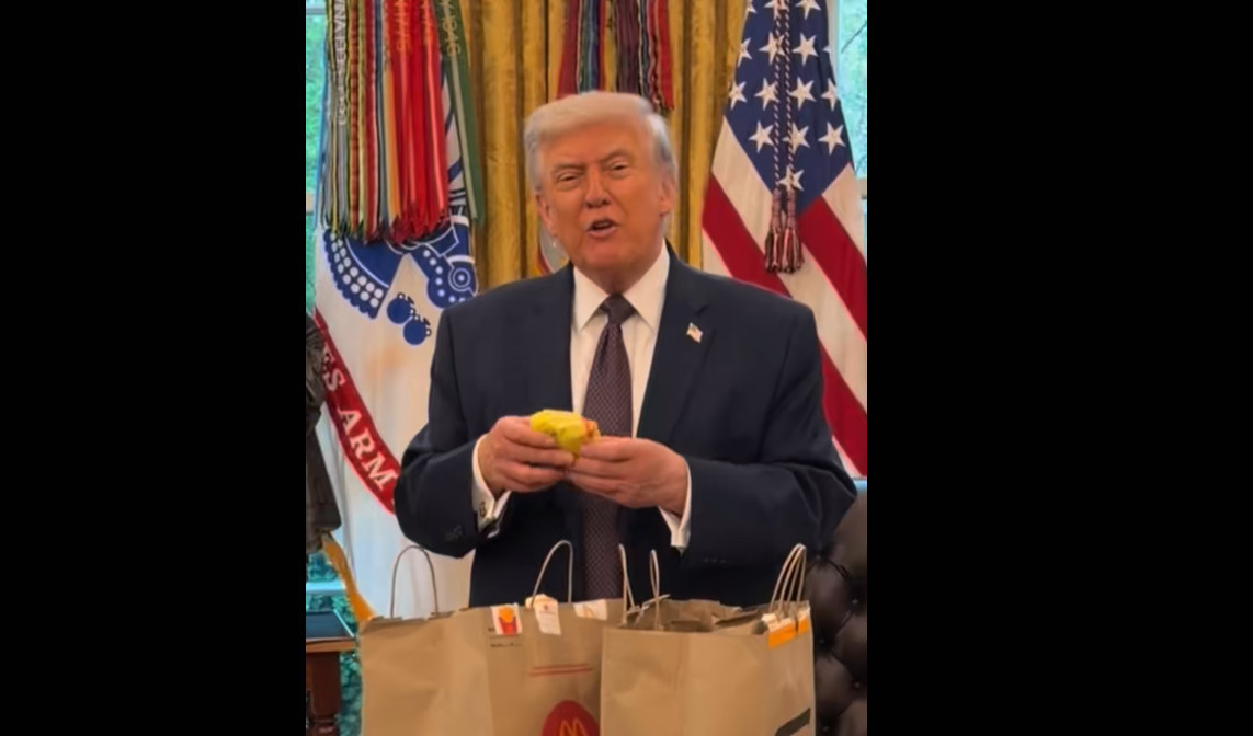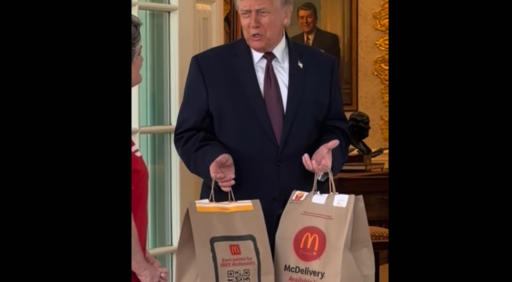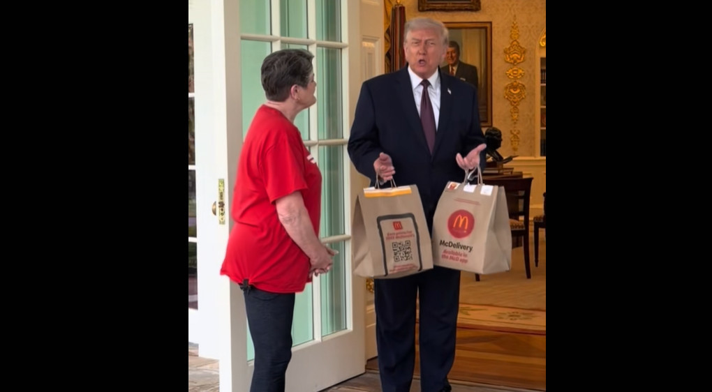 지난 13일(현지시각) 트럼프 대통령은 백악관 웨스트윙 출입문으로 나와 배달앱 도어대시 기사 샤론 시먼스로부터 맥도날드 버거 세트를 직접 전달받았다. 치즈버거와 감자튀김 세트 등이다.