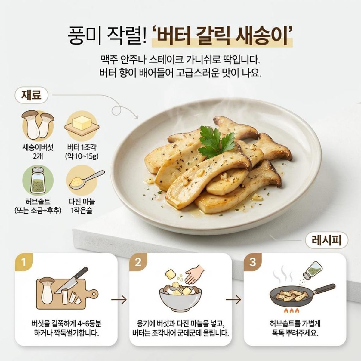 조금 더 풍미를 원한다면 '버터 갈릭' 조합이 어울린다. 새송이버섯을 길쭉하게 나누거나 깍둑썰기해 용기에 담고 다진 마늘과 버터를 올린다. 허브솔트나 소금, 후추를 가볍게 더한 뒤 2분 30초에서 3분 정도 돌린다. 꺼내서 한 번 뒤섞으면 버터 향이 골고루 배어 맥주 안주나 고기 요리 곁들임으로 활용하기 좋다.