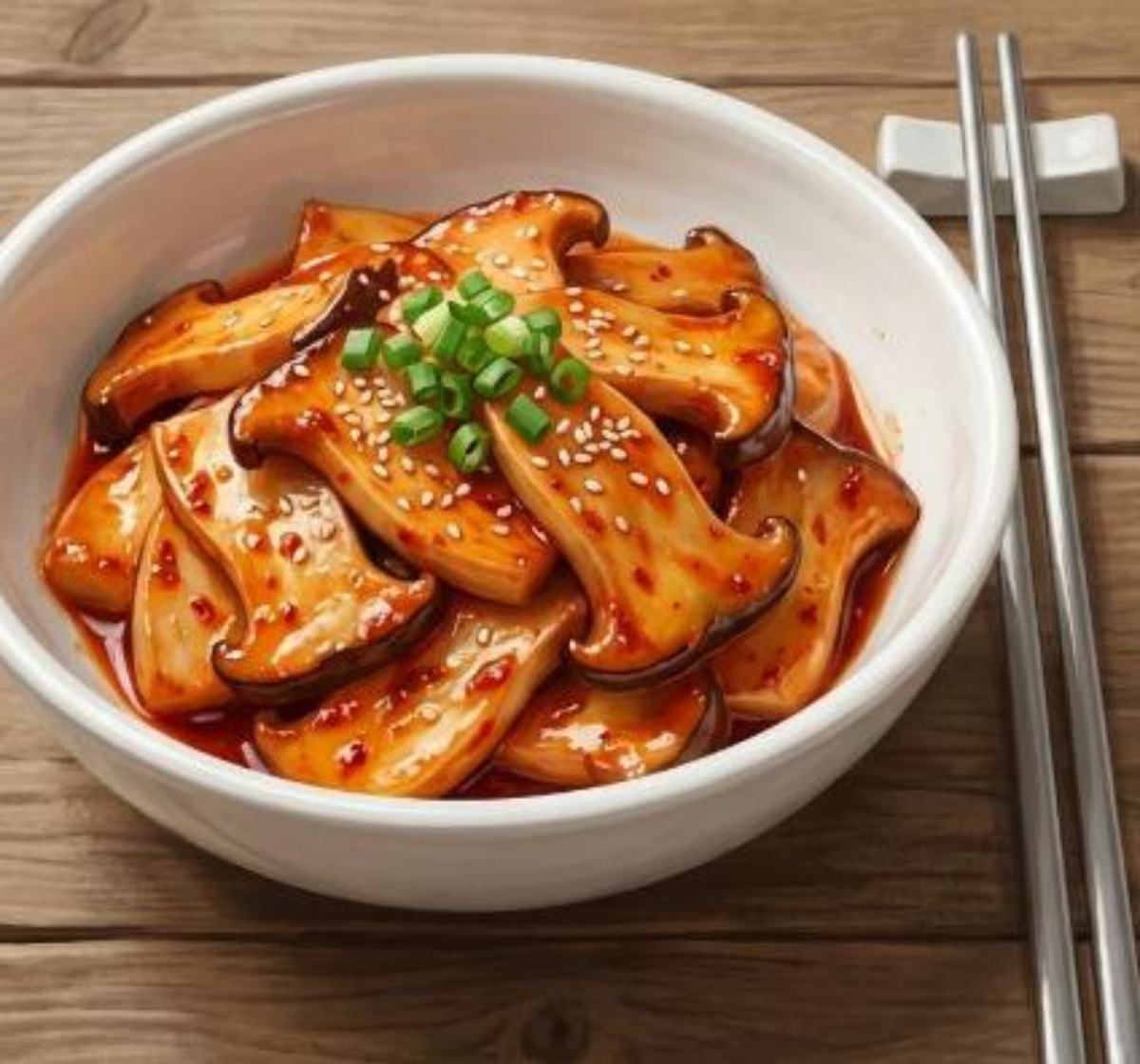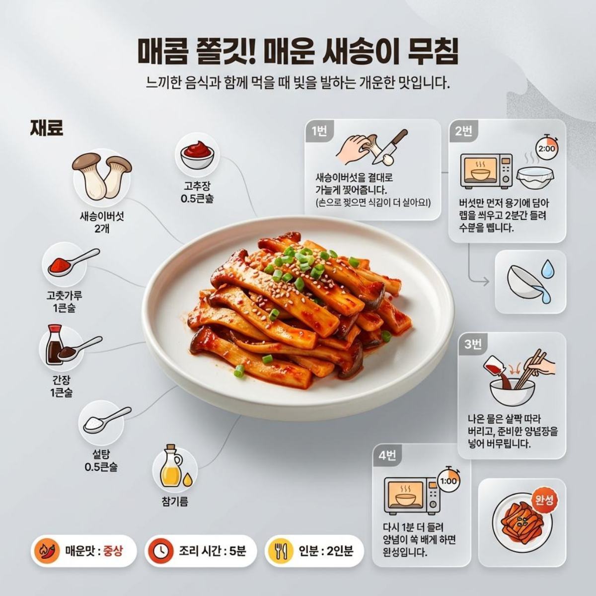 느끼한 음식과 함께라면 '매콤한 무침'이 어울린다. 새송이버섯을 결대로 가늘게 찢어 용기에 담고 먼저 2분간 돌려 수분을 뺀다. 나온 물을 따라낸 뒤 고추장 반 큰술, 고춧가루 한 큰술, 간장 한 큰술, 설탕 반 큰술, 참기름을 넣어 버무린다. 다시 1분 정도 돌리면 양념이 속까지 배어 쫄깃한 식감이 살아난다.