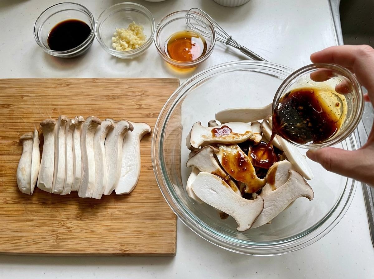 가장 기본은 '간장 양념'을 활용한 새송이찜이다. 새송이버섯 두 개를 0.5cm 안팎 두께로 썰어 전자레인지용 용기에 담는다. 간장 두 큰술, 올리고당 한 큰술, 다진 마늘 반 큰술을 섞어 골고루 뿌린 뒤 랩을 씌워 구멍을 몇 개 낸다. 3분간 돌린 후 참기름과 깨를 더하면 밥반찬으로 손색없는 맛이 완성된다. 단짠 조합이라 아이부터 어른까지 호불호가 거의 없다.