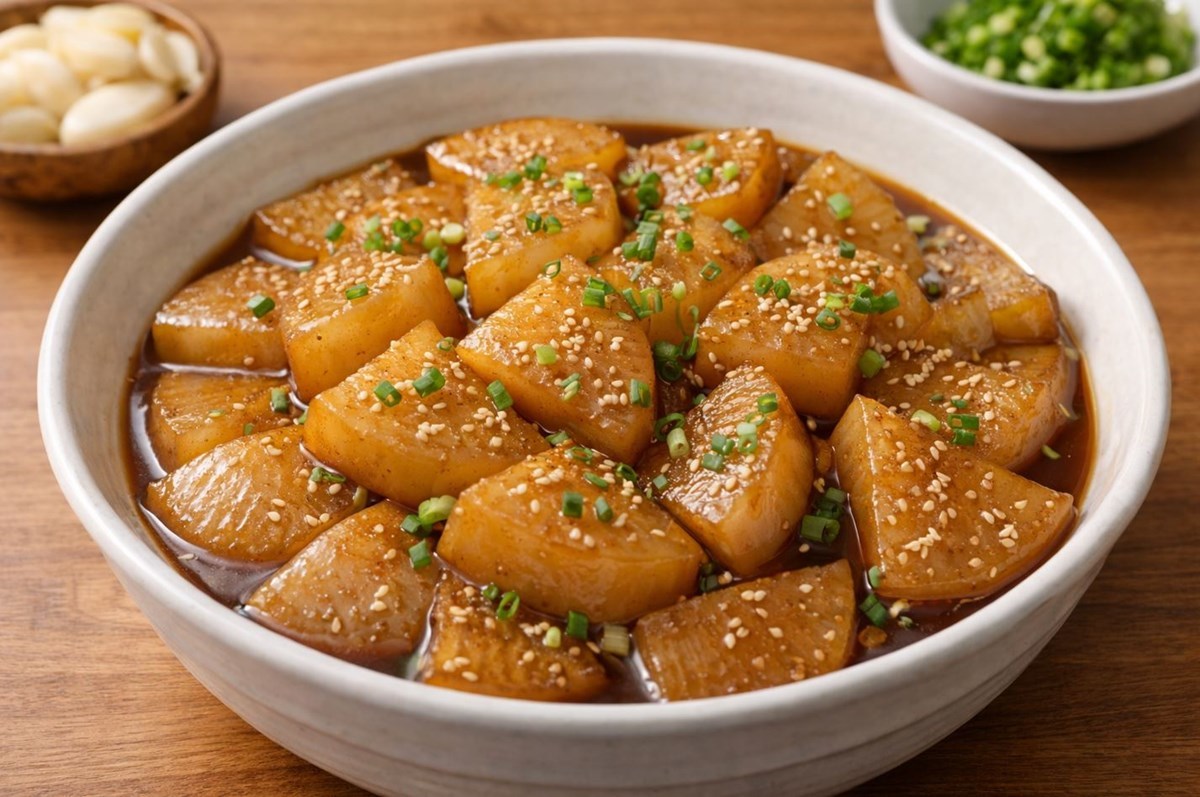 이후 불을 중약불로 줄여 무가 국물을 머금도록 천천히 졸이는 것이 핵심이다. 중간중간 무를 뒤집어 주면 위아래로 간이 고르게 배고 국물이 너무 빨리 줄면 물을 조금씩 보태어 타지 않게 조절한다. 무가 젓가락이 부드럽게 들어갈 정도로 익고, 국물이 절반 이하로 줄어들며 농도가 생기면 거의 완성 단계다.