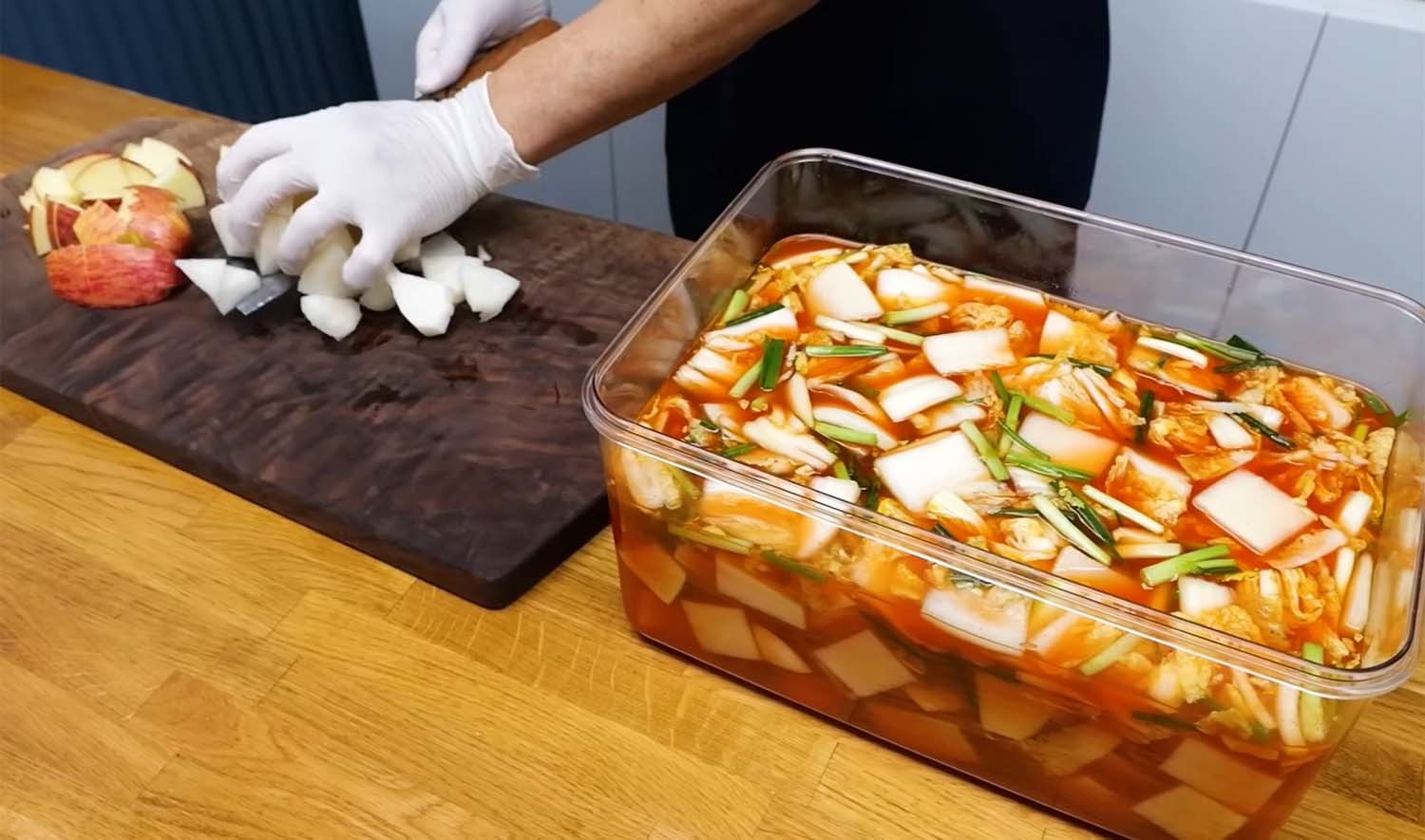 쪽파 반 줌을 3cm 간격으로 썰어 넣어준다. 김 셰프는 "미나리를 좋아하는 분들은 미나리 반 줌 정도 넣으면 또 상큼하고 맛있다"고 말했다. 잘 섞은 후 간을 본다. 간이 심심하면 천일염 1스푼을 추가한다. 사과와 배는 바로 썰어 넣지 않고 3일 숙성한 뒤에 넣는다. 김 셰프는 "바로 넣으면 갈변이 일어난다"고 했다.