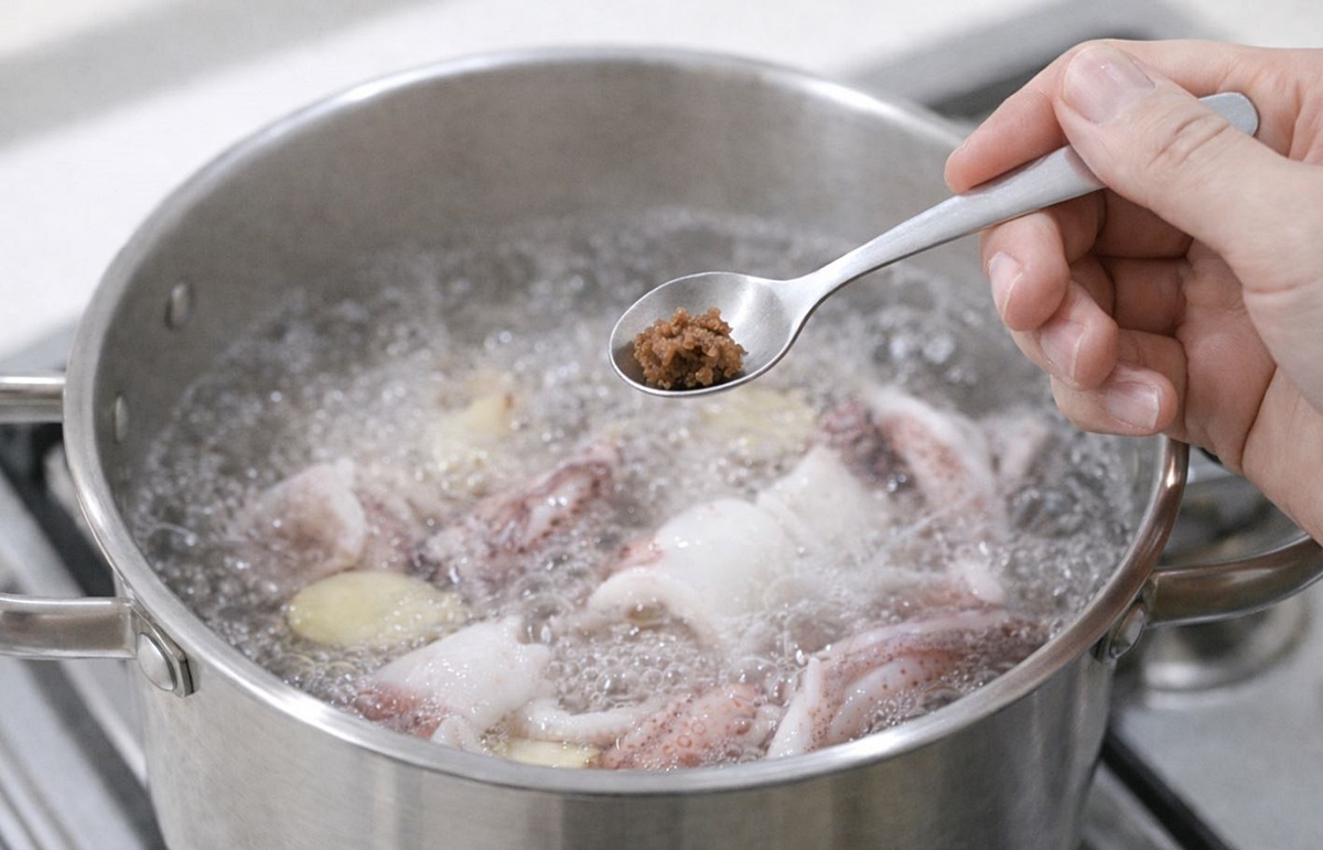된장은 많이 넣으면 국물 색이 탁해지고 맛이 진해질 수 있으니 물이 끓기 시작할 때 반 작은술 정도만 풀어 은은하게 향을 더하는 정도가 좋다. 이 정도만 넣어도 오징어에서 나는 냄새가 덜하고 삶은 뒤에 살짝 감칠맛이 돌면서도 부담스럽지 않은 맛으로 정리된다.