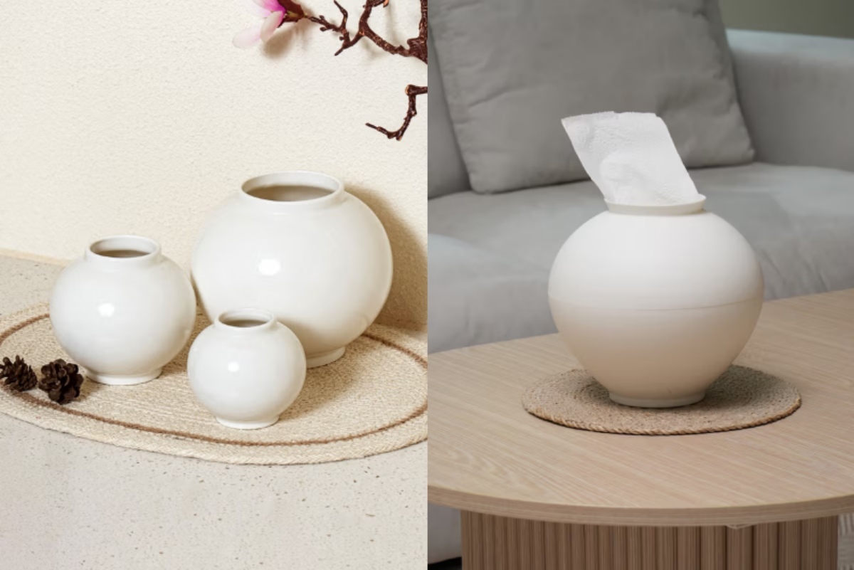 먼저 풍요로움을 상징하는 달항아리 상품을 준비했다. 보름달을 닮은 곡선미가 인상적인 ‘유광 달 항아리 인테리어 오브제’는 유광 마감으로 표면에 은은한 광택이 흐르는 것이 특징이다. 선반이나 탁자 위에 올려두면 공간 분위기를 정돈해 주고 생화를 꽂거나 디퓨저 홀더로 활용하는 것도 가능하다.