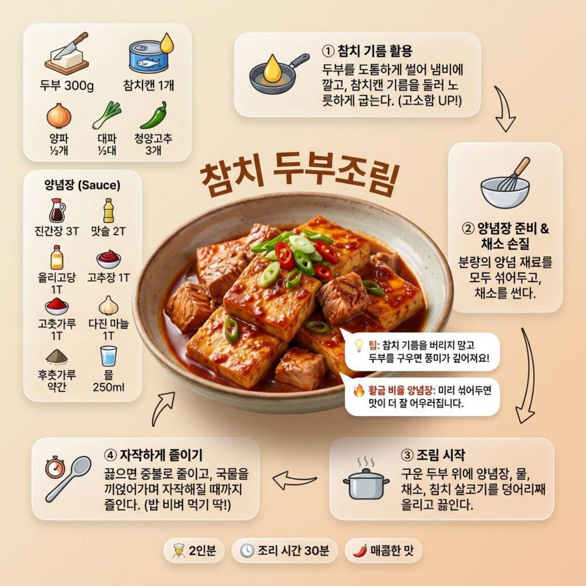 이럴 때 우리 집 냉장고와 찬장을 열어보면 가장 먼저 눈에 띄는 것이 바로 두부 한 모와 참치캔 하나다. 이 두 가지 재료는 가격이 저렴하고 보관이 쉬워 어느 집에서나 흔히 볼 수 있는 단골 식재료들이다. 최근 요리 커뮤니티와 자취생들 사이에서 이 평범한 재료 두 가지만으로 고기반찬 부럽지 않은 맛을 내는 참치 두부조림이 화제를 모으고 있다. 30년 차 기자의 시선으로 이 요리를 직접 분석해 보니 복잡한 과정 없이도 입맛을 확 잡아끄는 비결은 의외로 간단한 조리 순서와 버려지던 재료의 활용에 있었다.