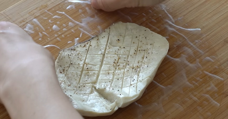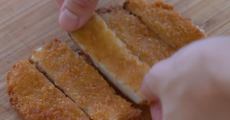 다만 버섯에 튀김옷이 잘 붙고 바삭하면서도 칼로 잘 썰리는 돈까스를 만들기 위해서는 수분 조절이 가장 중요하다. 새송이버섯은 자체 수분이 많은 식재료이기 때문에 손질 후 바로 튀김옷을 입히기보다 키친타월로 단면까지 한 번 더 눌러 물기를 제거해 주는 과정이 필요하다.