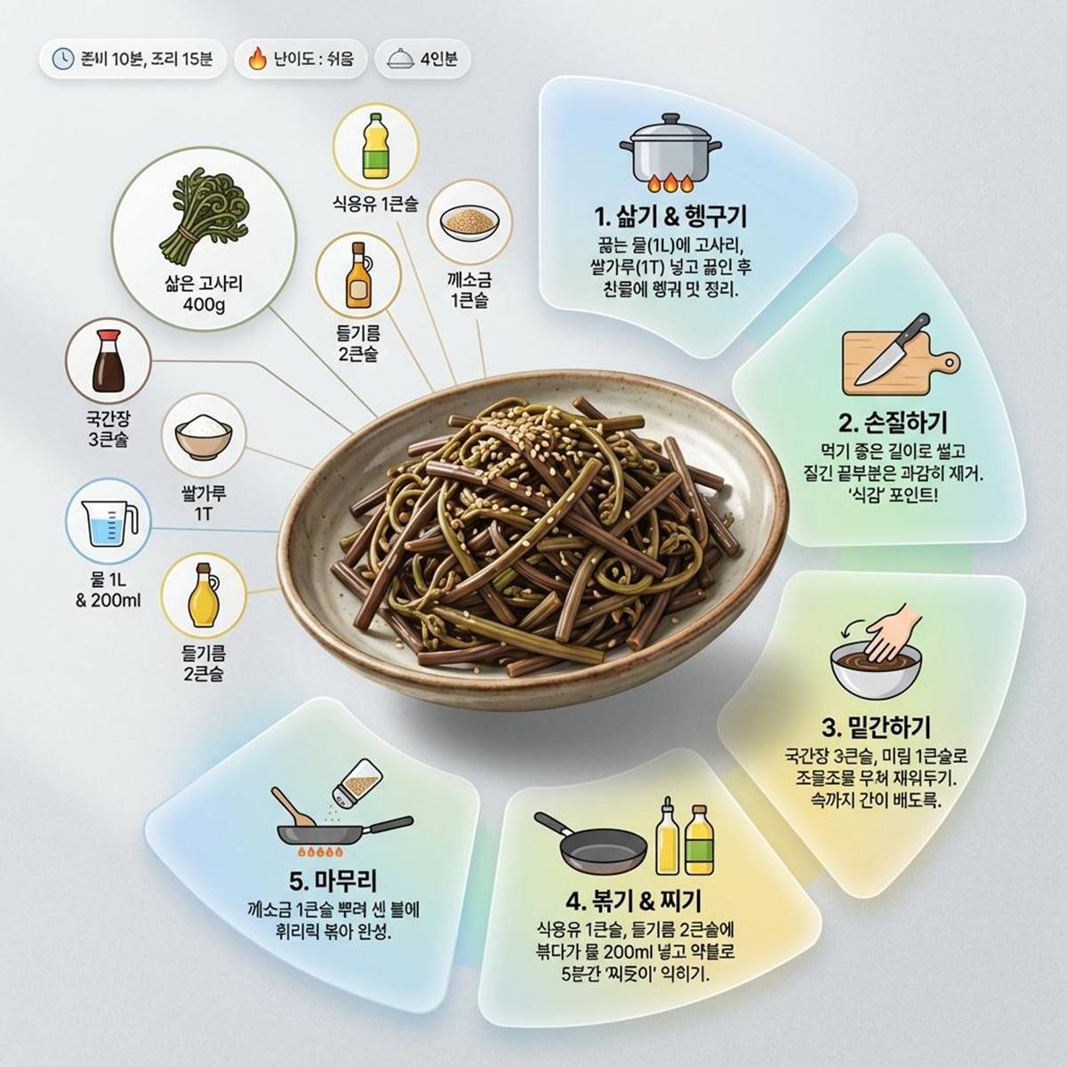 정리하면 레시피는 이렇다. 재료는 고사리 400g, 쌀가루 1T. 밑간은 국간장 3T, 미림 1T. 양념은 들기름 2T, 물 200ml(1컵=200ml, 1T=성인숟가락 기준)이다. ‘맹물에 삶지 말고 쌀가루를 한 스푼’이라는 포인트만 기억해도, 쓴맛과 잡향을 줄이고 부드러운 식감을 끌어올리는 데 도움이 된다.