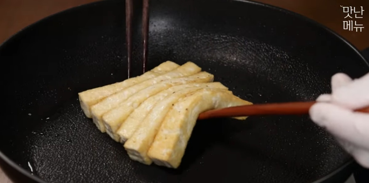 그런 다음 두부에 소금과 후추를 뿌린 후 노릇노릇하게 돌려가며 구워준다. 준비한 재료를 그대로 두고, 계란 2개를 깨뜨린 후 소금 뿌려 잘 풀어준다.