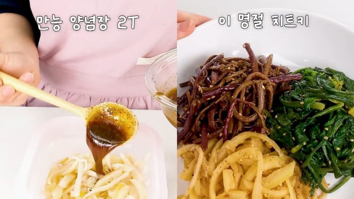나물별 조리 과정을 살펴보면, 먼저 도라지는 소금 1스푼을 넣고 충분히 무쳐 특유의 쓴맛을 제거하는 것이 첫 단계다. 이후 깨끗한 물에 헹궈 물기를 완전히 털어낸 뒤, 전자레인지 전용 용기에 담아 약간의 물을 넣고 딱 2분간 가열한다. 익은 도라지에 미리 만들어둔 만능 양념장 2스푼과 통깨를 뿌려 조물조물 무쳐내면 도라지나물이 완성된다.