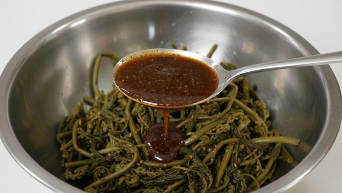 가장 먼저 준비해야 할 것은 나물 맛을 결정지을 만능 양념장이다. 간장 3스푼, 꽃게액 3스푼, 여기에 포인트 재료인 들기름 3스푼과 들깨가루 1스푼을 추가하면 완성된다. '신내린셰프'는 들깨가루가 들어감으로써 과하지 않으면서도 나물 특유의 고소함을 한층 깊게 살려준다고 전했다.
