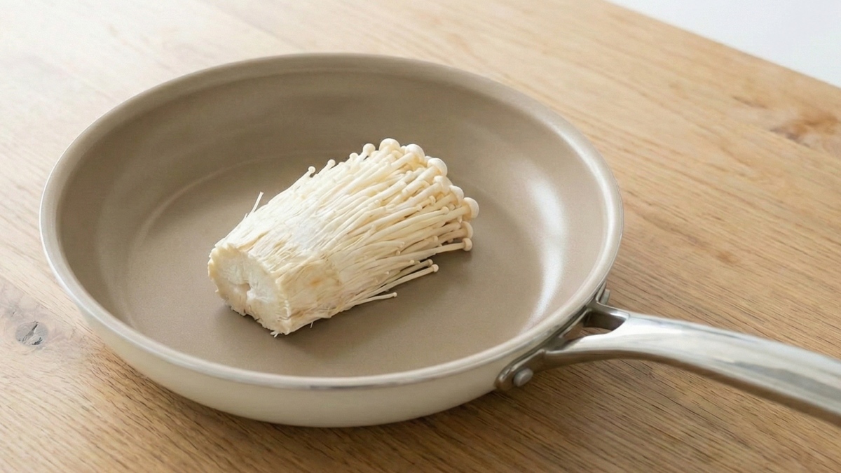 이 레시피의 핵심은 '기름 없이 볶기'다. 예열된 팬에 아무것도 두르지 않은 상태로 팽이버섯을 넣고 중불에서 강불 사이로 볶는다. 처음에는 수분이 나오면서 팬에 달라붙는 듯 보이지만, 계속 뒤적이면 자연스럽게 숨이 죽으며 익는다. 팽이버섯이 익어 부피가 줄어들면 불을 끄고 한 김 식힌다.