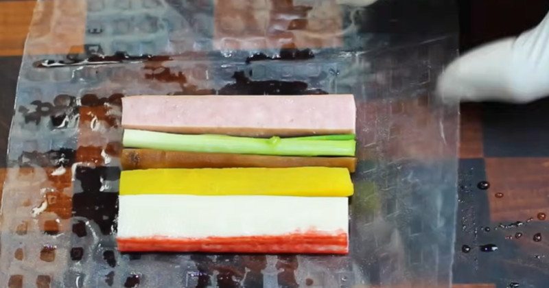 재료 준비는 기존 꼬지전과 크게 다르지 않다. 사각 햄, 맛살, 노란 단무지, 데친 시금치나 파프리카, 얇게 썬 소고기나 어묵 등을 같은 길이로 맞춰 썬다. 두께가 너무 두꺼우면 말 때 터질 수 있으니 0.5센티미터 안팎으로 맞추는 것이 좋다. 고기를 사용할 경우에는 소금과 후추로 가볍게 밑간을 해두고, 팬에 살짝 익혀 수분을 날려둔다. 수분이 많으면 라이스페이퍼가 쉽게 찢어질 수 있기 때문이다.