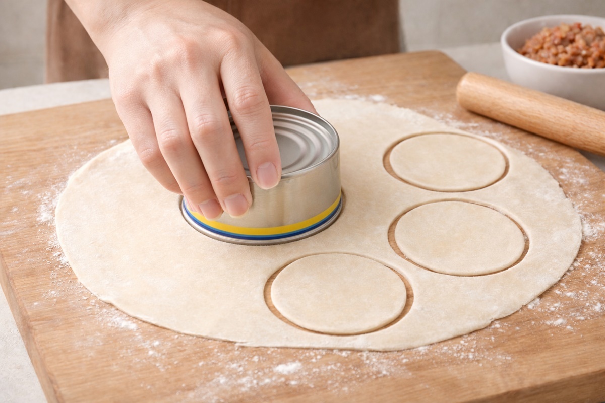 밀대로 반죽을 얇고 균일하게 민 다음, 캔의 입구 부분을 아래로 향하게 하여 반죽 위에 올리고 가볍게 눌러 주면 동그란 만두피가 손쉽게 완성된다. 힘을 고르게 주면 가장자리가 매끄럽게 정리되어 만두를 빚을 때 모양이 단정하게 잡힌다. 일정한 크기의 만두피를 여러 장 빠르게 만들 수 있어 작업 효율도 높아진다.