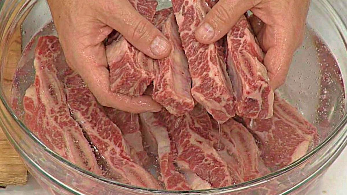그다음이 핏물 제거 단계다. 흔히 맹물에 4~5시간 담가두지만, 이 방법은 핏물과 함께 고기 속 단맛과 육즙까지 빠져나가 퍽퍽해질 가능성이 크다. 이때 맹물 대신 탄산수를 사용하면 시간이 크게 줄어든다. 방법은 간단하다. 세척한 갈비가 잠길 정도로 탄산수를 붓고 5~10분만 담가둔다.