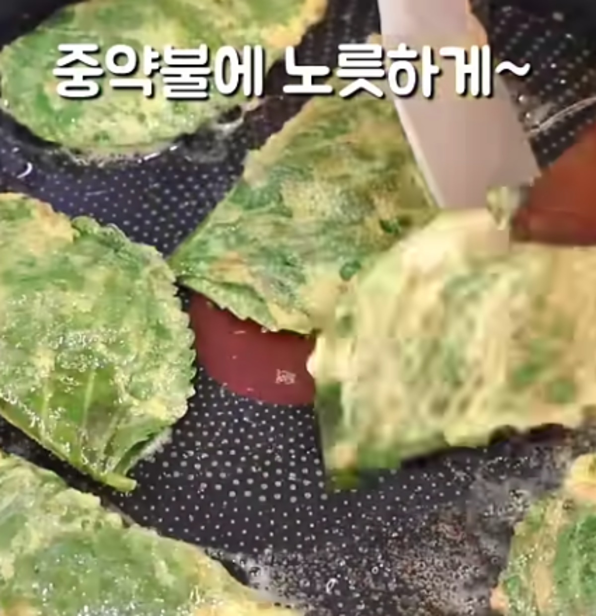 프라이팬에 식용유를 넉넉하게 두른 후 중약불에 노릇하게 구워주면 맛있는 깻잎전 완성이다.
