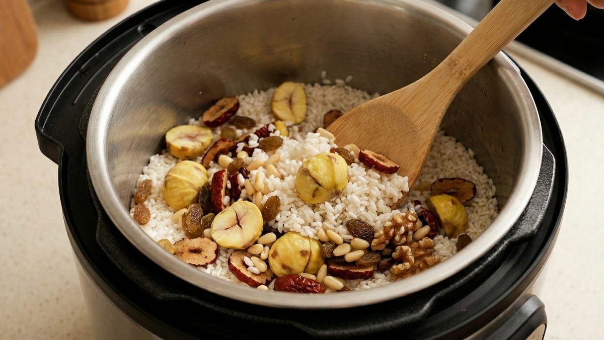 재료 혼합: 전기밥솥에 불린 찹쌀과 손질한 밤, 대추, 견과류를 넣고 나무 주걱으로 살살 버무린다.