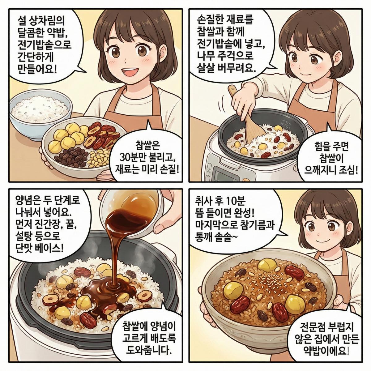 설 상차림에서 달콤한 약밥은 밥상 한 켠을 풍성하게 만드는 대표 음식이다. 손이 많이 갈 것처럼 보이지만, 전기밥솥을 활용하면 찹쌀 불리기와 재료 준비, 양념 배합만으로도 집에서 충분히 깔끔하게 완성할 수 있다.