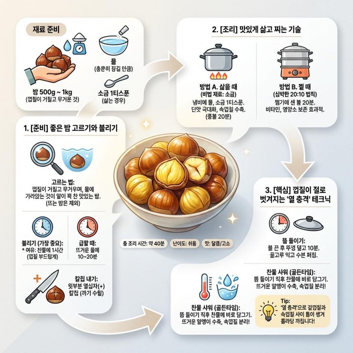 껍질을 쉽게 까는 결정적인 단계는 삶거나 찐 뒤의 처리다. 불을 끈 직후 바로 뚜껑을 열지 말고 10분 정도 뜸을 들인다. 내부까지 열이 고르게 퍼지며 수분 균형이 맞춰진다. 이후 뜨거운 밤을 곧바로 찬물에 담근다. 이 과정에서 알맹이는 급격히 식고, 속껍질은 수축하면서 겉껍질과의 사이에 틈이 생긴다. 이른바 열 충격 효과로, 손으로만 눌러도 껍질이 벗겨질 정도로 분리가 쉬워진다.