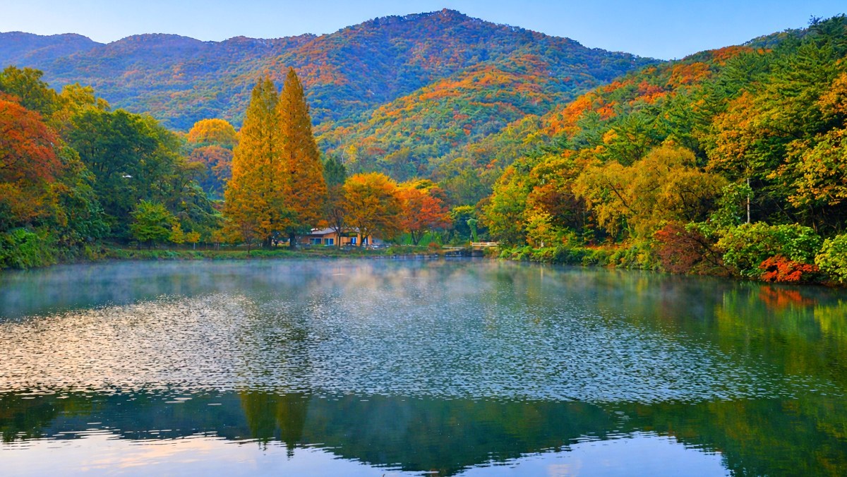 충남 공주시 반포면에 자리한 농업용 저수지인 '공주 불장공저수지'다. 이곳은 1975년 송곡리 농업용수 공급을 목적으로 만들어졌다. 이른 아침 피어오르는 물안개와 호수 주변의 메타세쿼이아, 단풍나무가 수면에 비치는 물반영이 장관을 이룬다.