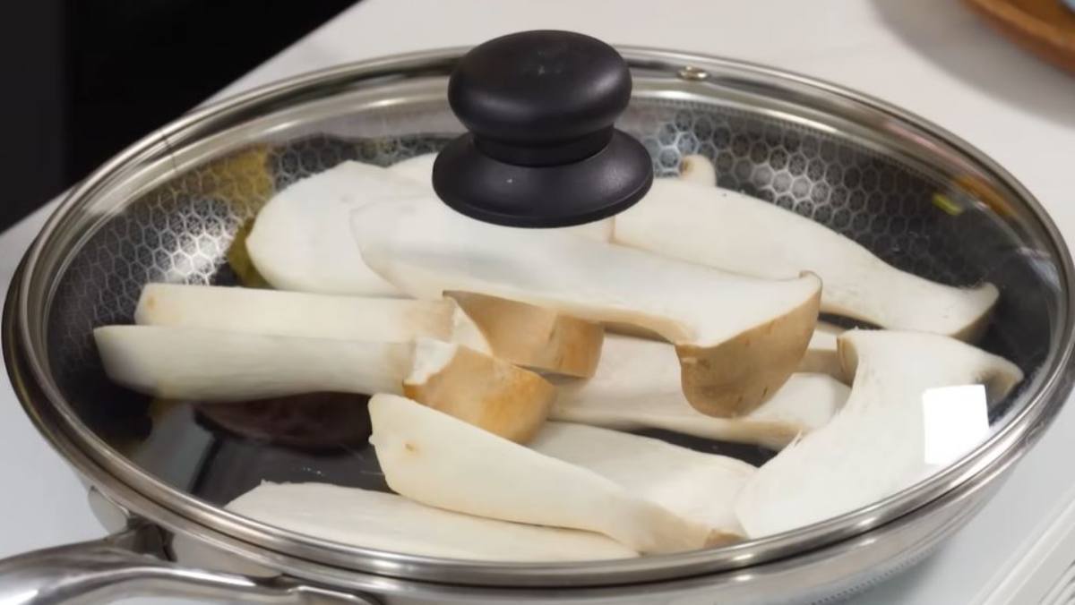 먼저 깨끗한 물에 가볍게 헹군 새송이버섯 네 송이를 준비한다. 버섯은 너무 얇지 않고 도톰하게 썰어야 씹는 맛이 산다. 팬에 버섯을 올리고 물 두 숟가락만 살짝 뿌린 뒤 뚜껑을 닫는다. 중약불에서 익히다 보면 버섯 자체에서 수분이 나오는데, 이때 불을 약하게 조절한다.