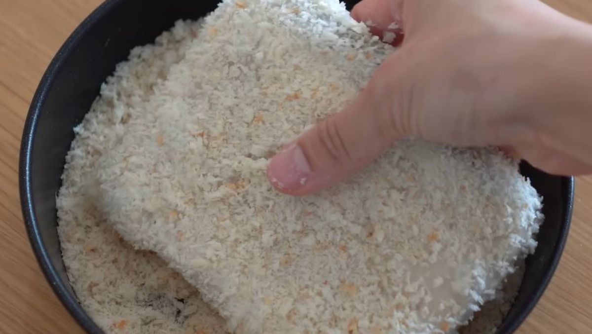 다음으로 밀가루 50g과 물 100g을 섞어 반죽물을 만든다. 버섯을 반죽물에 충분히 적신 뒤 마지막으로 빵가루를 골고루 입힌다. 빵가루를 입힐 때는 손바닥으로 살짝 눌러주어야 튀길 때 가루가 쉽게 떨어지지 않는다. 팬에 기름을 넉넉히 두르고 달군 뒤 중불에서 앞뒤로 노릇노릇하게 튀겨내면 된다. 버섯은 생으로도 먹을 수 있으므로 겉면이 갈색빛을 띠면 바로 건져내도 무방하다.