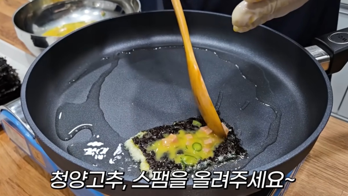 이 레시피에서 가장 주목할 부분은 스팸을 뜨거운 물에 데쳐내는 과정이다. 캔 햄 종류는 가공 과정에서 보존성과 맛을 위해 나트륨과 지방 함량이 높게 설정된다. 뜨거운 물을 부어주는 전처리 과정은 스팸 표면의 과도한 기름기와 염분, 그리고 특유의 식품첨가물 냄새를 일부 제거하는 효과가 있다. 이는 결과적으로 김전이 지나치게 짜거나 느끼해지는 것을 방지하고 담백한 맛을 내는 기초가 된다.
