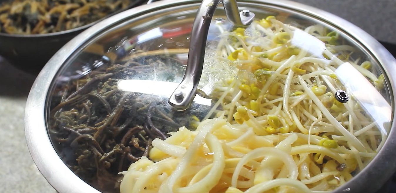 먼저 도라지는 가늘게 찢어 소금물에 바락바락 주물러 쓴맛을 제거한다. 이후 흐르는 물에 여러 번 헹군 뒤 물기를 빼고, 끓는 물에 소금을 약간 넣어 2분 정도 데친다. 너무 오래 삶으면 질겨질 수 있으니 시간을 지키는 것이 좋다. 고사리는 미리 불려 삶아 둔 것을 사용한다. 질긴 줄기 부분은 제거하고 먹기 좋은 길이로 자른다. 콩나물은 뿌리를 정리한 뒤 깨끗이 씻어 체에 밭쳐 둔다.