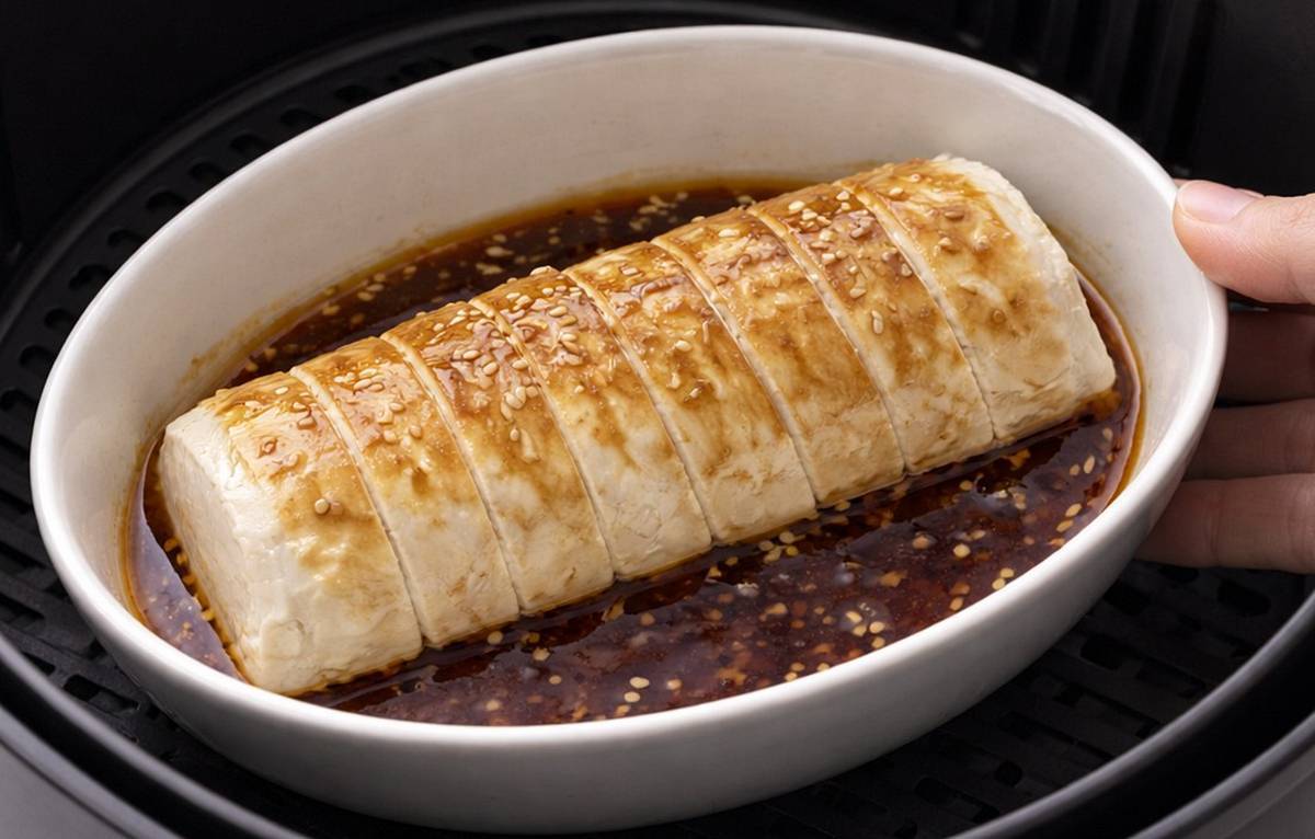 조리 과정은 간단하다. 순두부를 에어프라이어 사용 가능한 그릇에 담아 소스가 스며들도록 칼집을 낸다. 시간이 허락한다면 순두부의 간수(물기)를 빼주면 식감이 더 탄탄해진다. 소스는 진간장 1스푼, 굴소스 1스푼, 알룰로스 1/2스푼(없으면 올리고당 1/2), 올리브유 1.5스푼을 섞어 순두부 위에 골고루 붓는다. 이후 에어프라이어 180도에서 18~20분가량 구우면 기본 완성이다. 기기 사양에 따라 시간과 온도는 조절하면 된다.