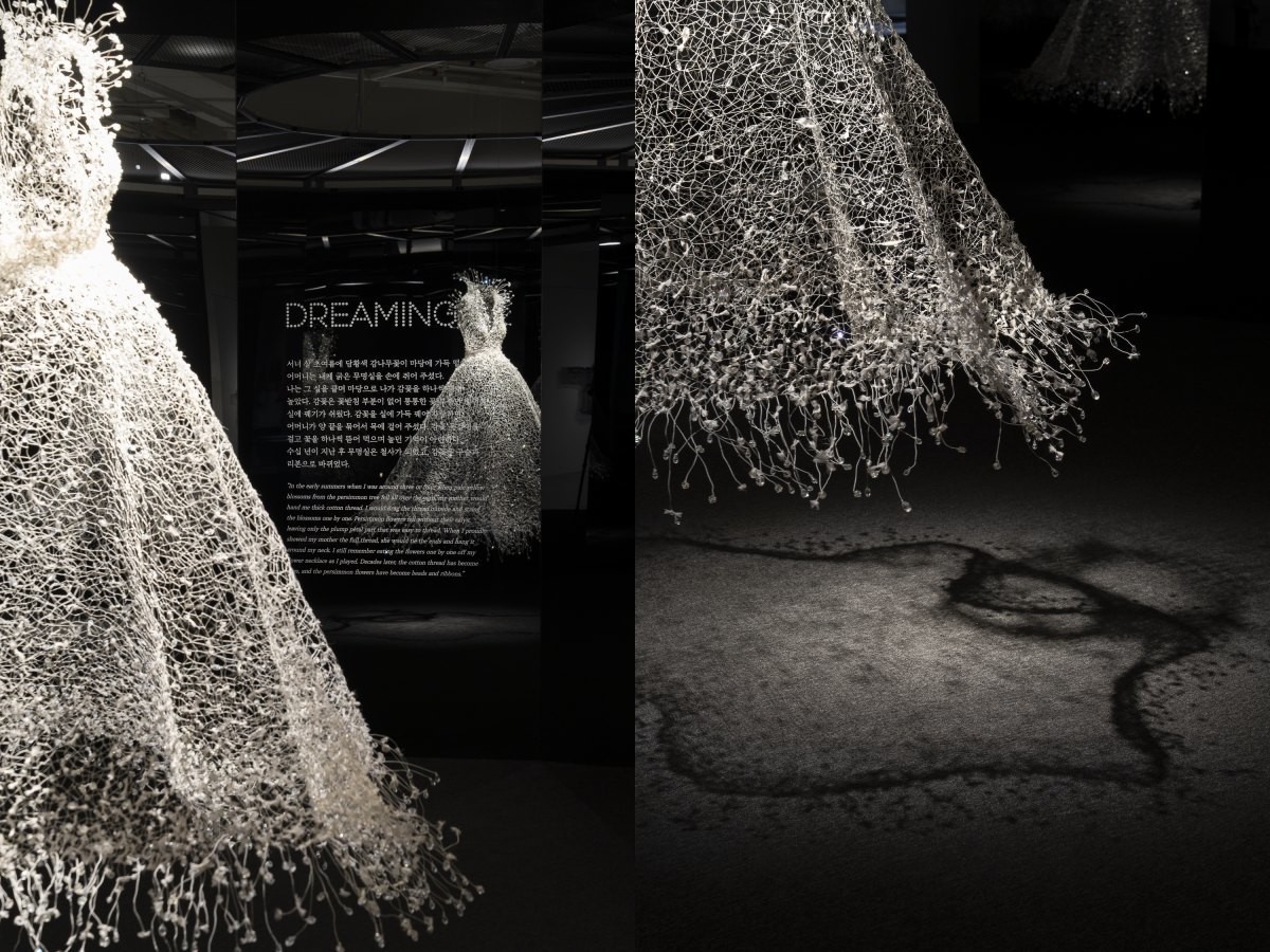 이번 전시는 한국 ‘패션아트’의 선구자로 꼽히는 금기숙 작가의 작품 세계를 조명하는 기증특별전이다. 금 작가는 1990년대 초부터 ‘미술의상’ 개념을 한국적 맥락에서 재해석해 철사 구슬 노방과 함께 스팽글 빨대 스펀지 은박지 등 쓰고 버려지는 폐기물까지 비전통적 재료를 활용한 작업을 이어왔다. 의상을 ‘입는 예술’로 확장하는 데 그치지 않고 공간을 구성하는 조형예술로 넓히며 패션아트의 영역을 확장해왔다는 설명이다. 그는 전시에 앞서 작품 56점과 아카이브 자료 485점을 서울공예박물관에 기증했다.