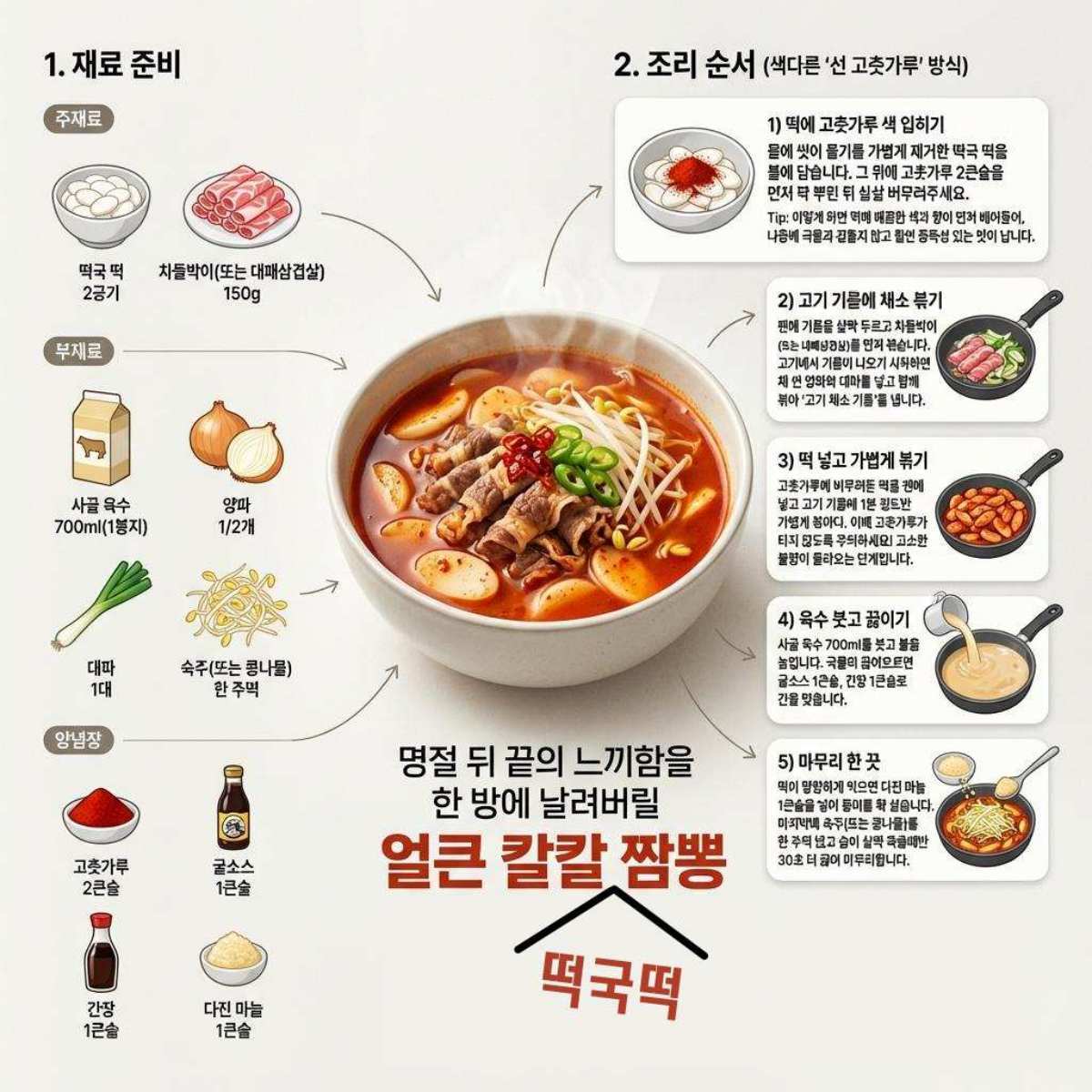 명절이 지나면 냉장고 한쪽에 떡국떡이 꼭 남는다. 그냥 끓여 먹기엔 물리고, 떡볶이로 바꾸자니 또 익숙하다. 이럴 때 '고춧가루'를 이용하는 방식으로 조리 방향을 틀면 전혀 다른 한 그릇이 나온다. 이름 그대로 얼큰 칼칼한 짬뽕 떡볶이국이다. 물 대신 사골 육수를 쓰고, 떡에 양념을 먼저 묻히는 방식이 핵심이다.