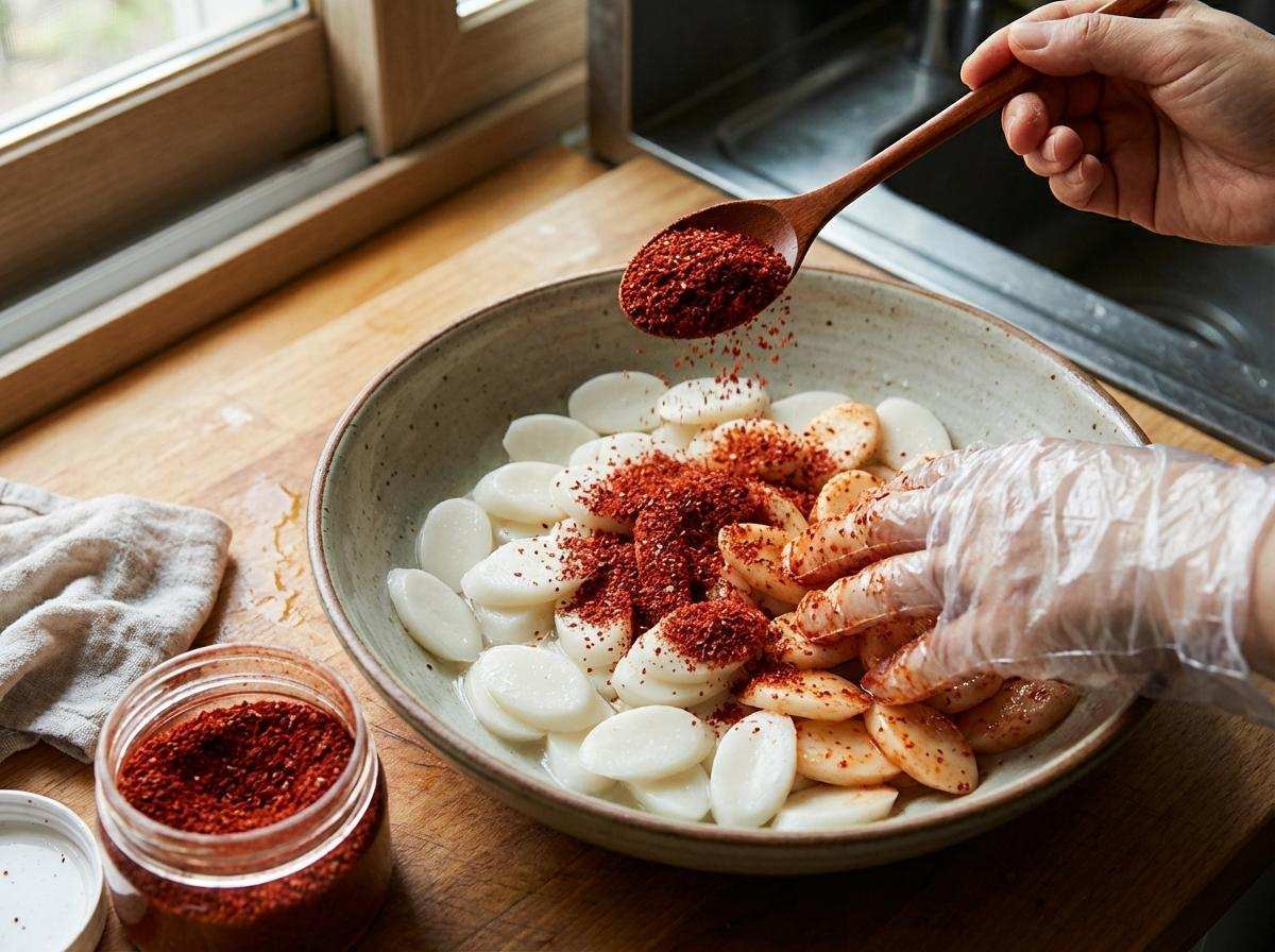 조리는 떡부터 시작한다. 떡국떡은 물에 가볍게 씻은 뒤 물기를 털어낸다. 여기에 고춧가루 2큰술을 먼저 뿌려 살살 버무린다. 이 과정에서 떡 표면에 고운 붉은색이 입혀진다. 나중에 국물에 넣었을 때 고춧가루가 따로 풀리지 않고 떡에 붙어 있어 맛이 겉돌지 않는다. 비주얼도 이 단계에서 이미 완성된다.