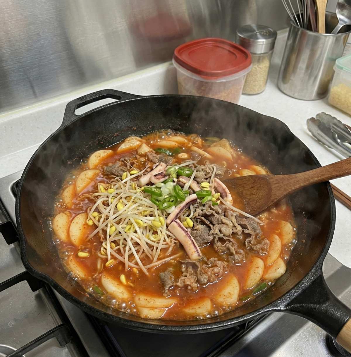 재료 구성은 단순하다. 떡국떡 2공기와 차돌박이 또는 대패삼겹살 150g이 주재료다. 국물은 사골 육수 700ml 한 봉이면 충분하다. 여기에 양파 반 개, 대파 한 대, 숙주나 콩나물 한 주먹을 더한다. 양념은 고춧가루 2큰술, 굴소스 1큰술, 간장 1큰술, 다진 마늘 1큰술로 끝난다. 추가 양념 없이도 맛의 골격이 잡힌다.