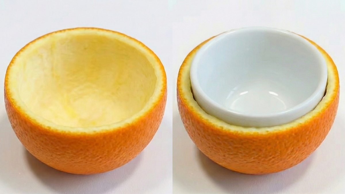 두 개 중 하나의 껍질을 뒤집어 다른 껍질 안에 겹쳐 넣는다. 이렇게 하면 안팎이 모두 주황색 껍질로 채워지면서 두께가 두 배가 돼 훨씬 단단해진다. 이제 여기에 실제 찻잔을 안쪽에 넣어 틀처럼 사용한다. 귤껍질을 잔 모양에 맞게 손으로 잘 매만져 형태를 잡은 뒤, 통풍이 잘 되는 곳에서 하루 이상 충분히 건조시킨다.