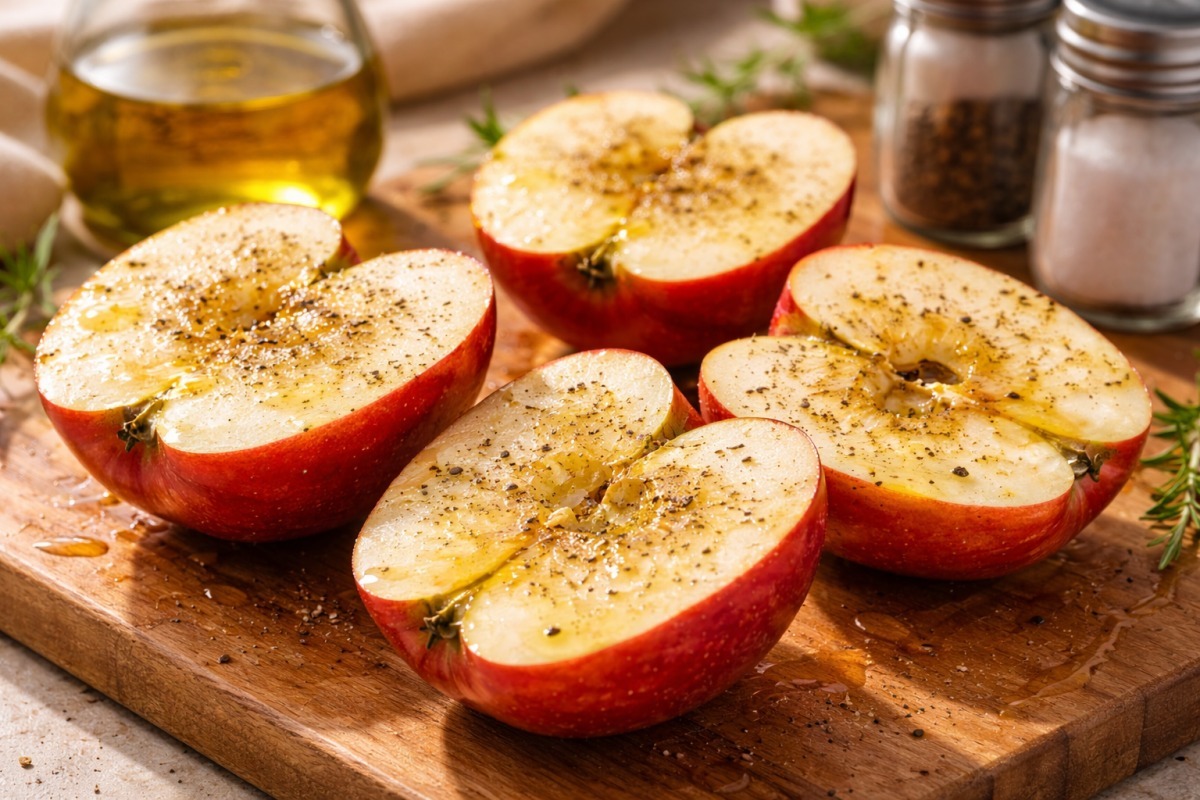 사진에는 사과 위로 올리브유와 후추가 듬뿍 뿌려진 모습이 담겼다. 생소하게 느껴지는 이 조합의 핵심은 흡수율과 항산화다. 사과의 비타민과 식이섬유가 올리브유의 지방산과 만나 영양소의 흡수 돕고, 후추가 이를 증폭시키는 역할을 한다.