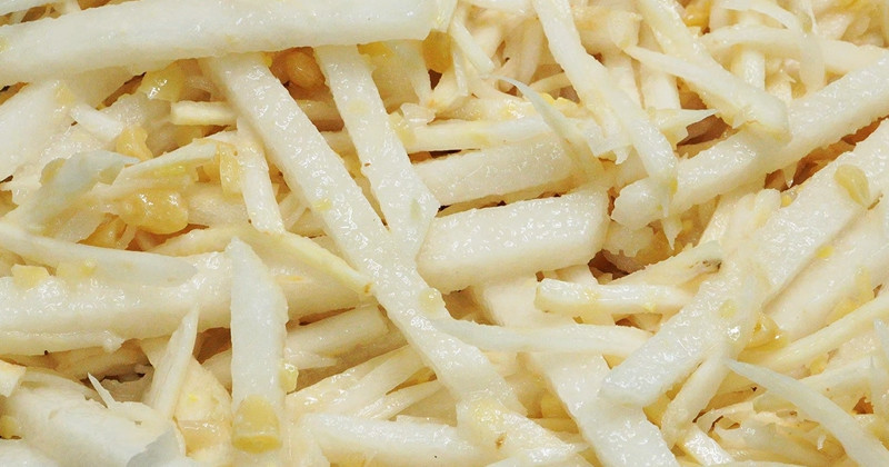 무는 껍질을 벗겨 가늘게 채 썬다. 소금을 약간 뿌려 10분 정도 절인 뒤 손으로 살짝 짜 수분을 제거한다. 이 과정을 거치면 무의 아삭함이 살아나고, 양념이 묽어지는 것을 막을 수 있다. 배는 껍질과 씨를 제거한 뒤 가늘게 채 썬다. 배는 갈변이 빠르므로 가장 마지막에 손질하는 것이 좋다. 필요하면 레몬즙을 몇 방울 떨어뜨려 색 변화를 막는다.