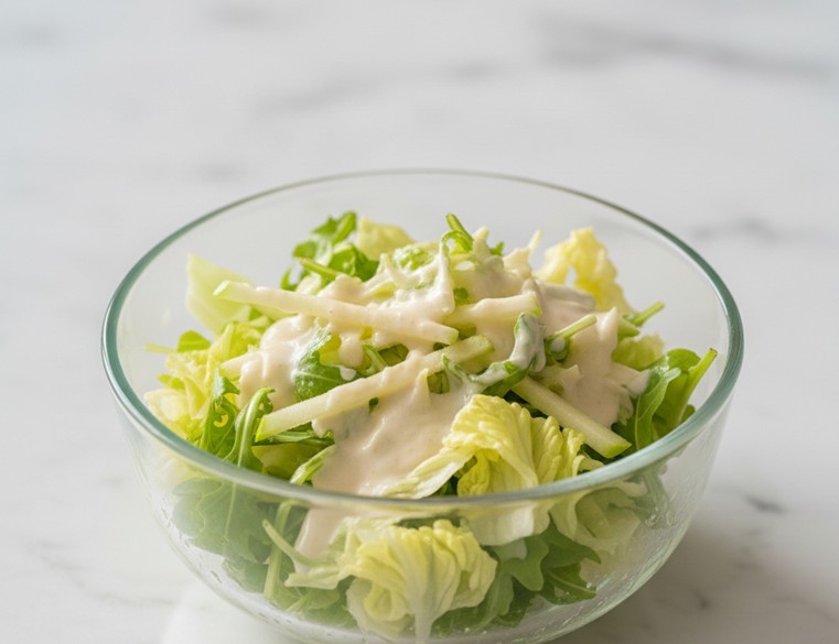 볼에 어린잎 채소와 양상추를 먼저 담고, 그 위에 채 썬 사과를 올린다. 견과류를 뿌린 뒤 먹기 직전에 드레싱을 넣어 가볍게 버무린다. 미리 드레싱을 섞어두면 채소에서 수분이 빠져 식감이 떨어질 수 있다. 손으로 오래 치대기보다는 집게로 살살 섞는 것이 아삭함을 유지하는 데 도움이 된다.