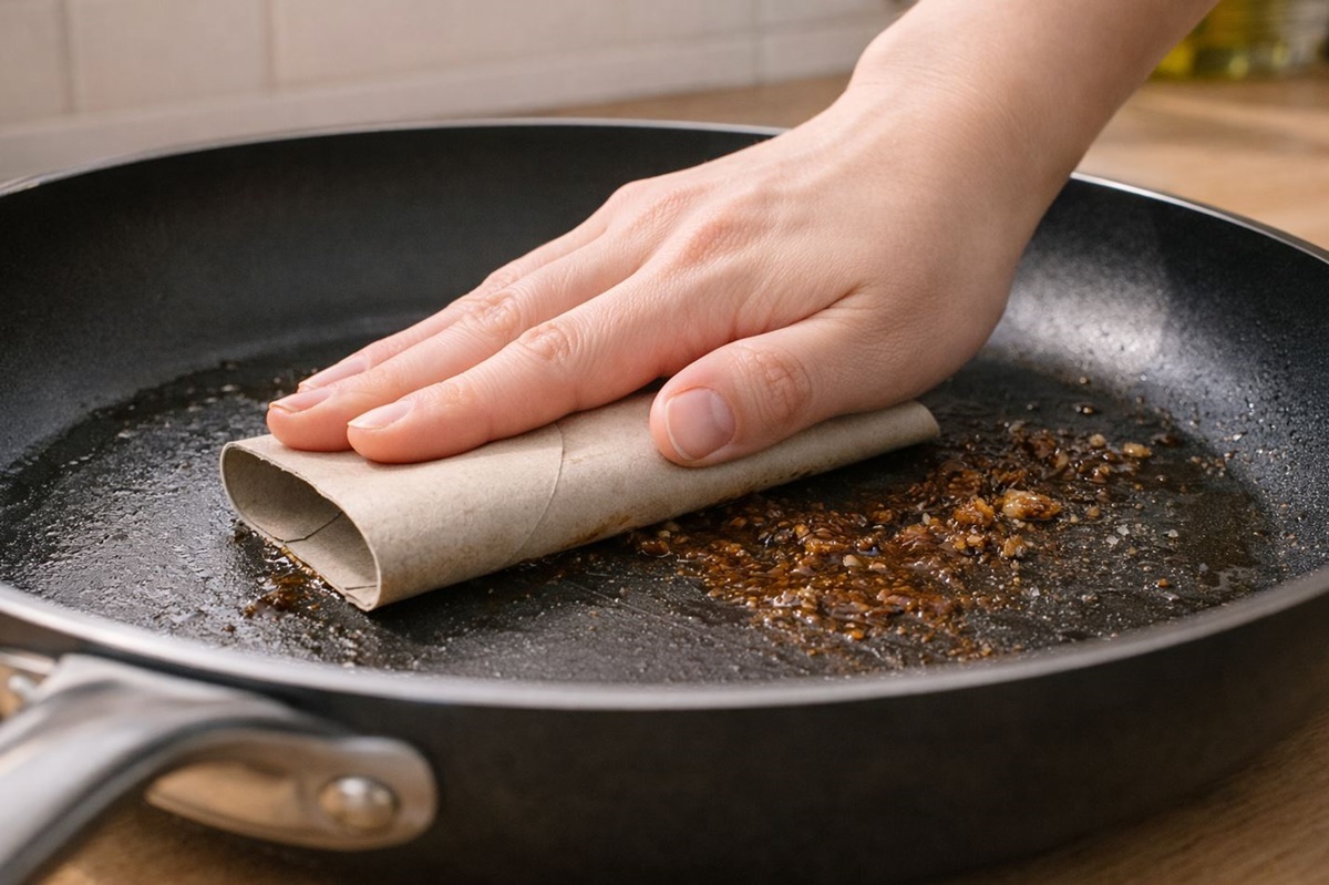이때 많은 사람들이 키친타월이나 물티슈를 사용하지만 의외로 잘 알려지지 않은 대안이 있다. 바로 휴지심을 활용한 기름기 제거용 스크래퍼다.