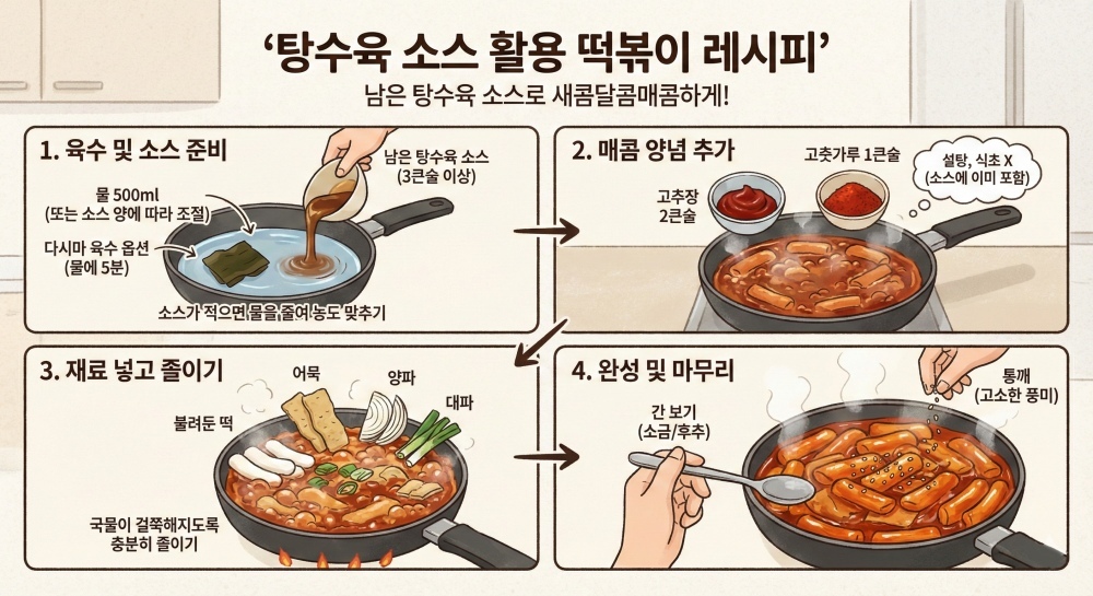 특히 떡국 떡을 활용하면 조리 시간도 짧다는 점이 강점이다. 명절 이후 남은 떡을 냉동 보관해두었다가 이렇게 활용하면 음식물 쓰레기를 줄이는 데도 도움이 된다. 남은 탕수육 소스 역시 마찬가지다. 다만, 소스는 빠른 시일 내 사용해야 하며 냄새나 색이 변했다면 사용하지 말아야 한다.